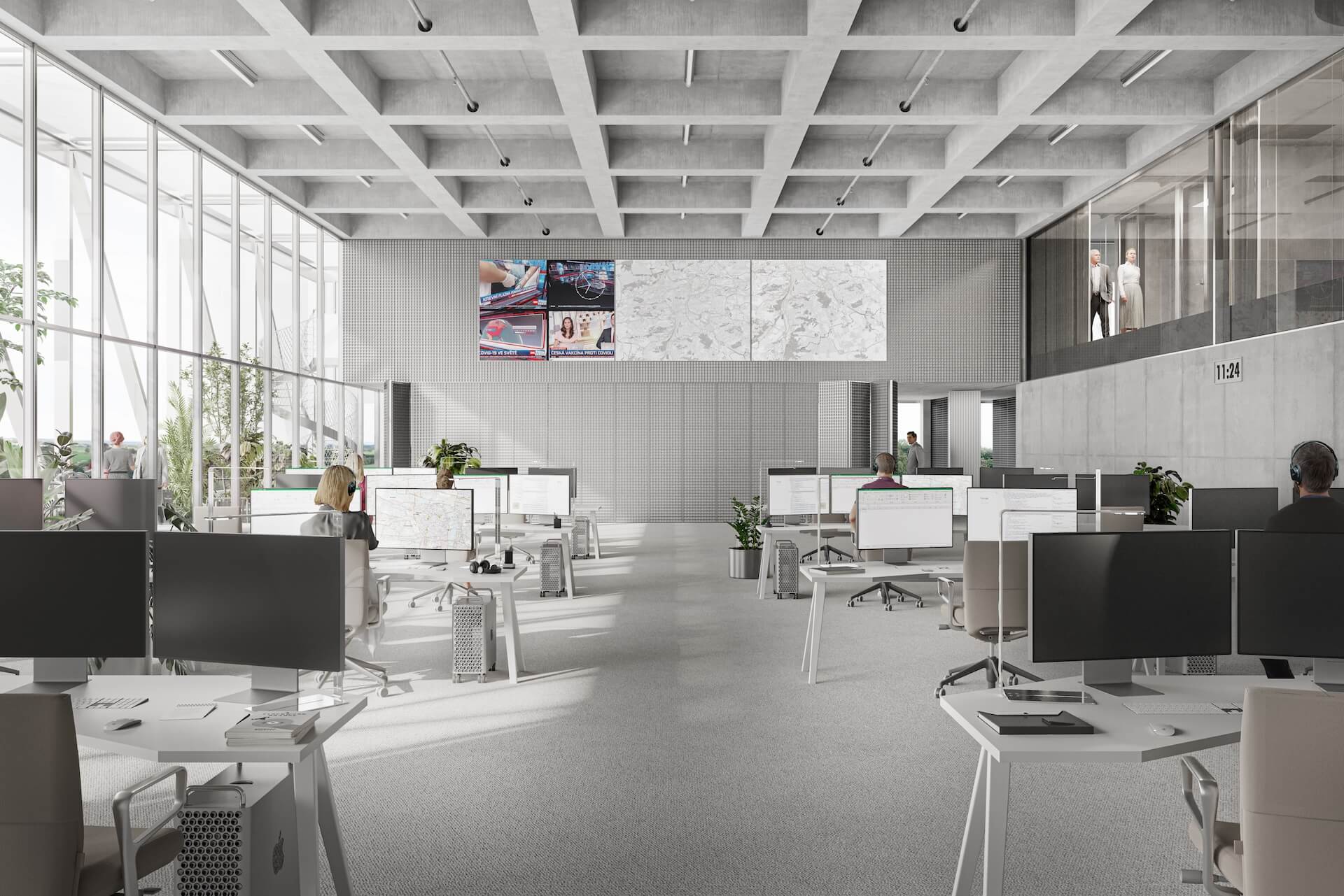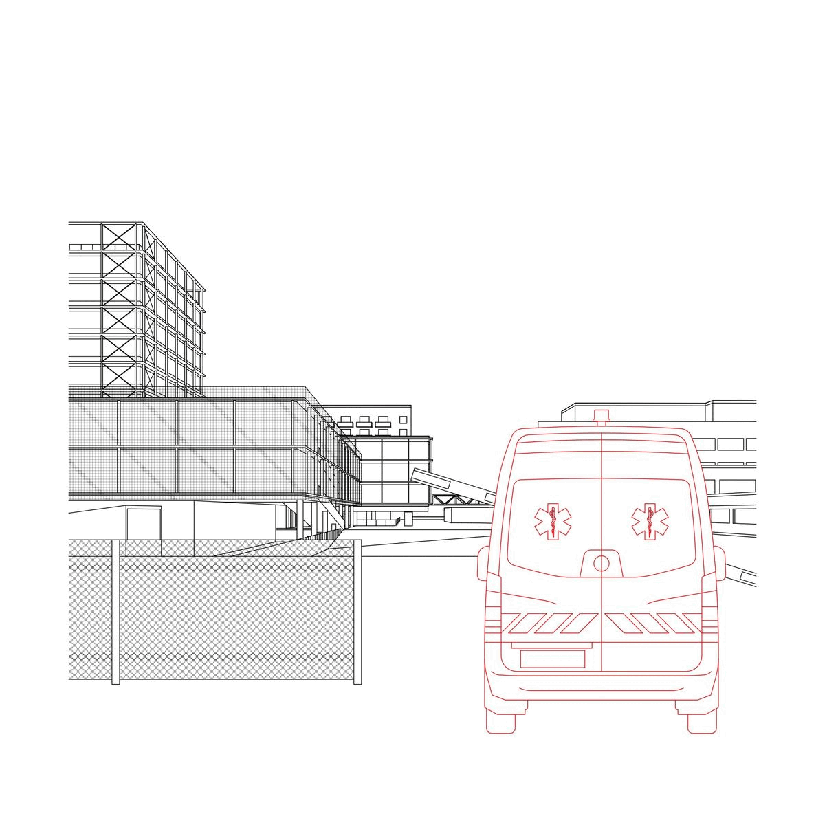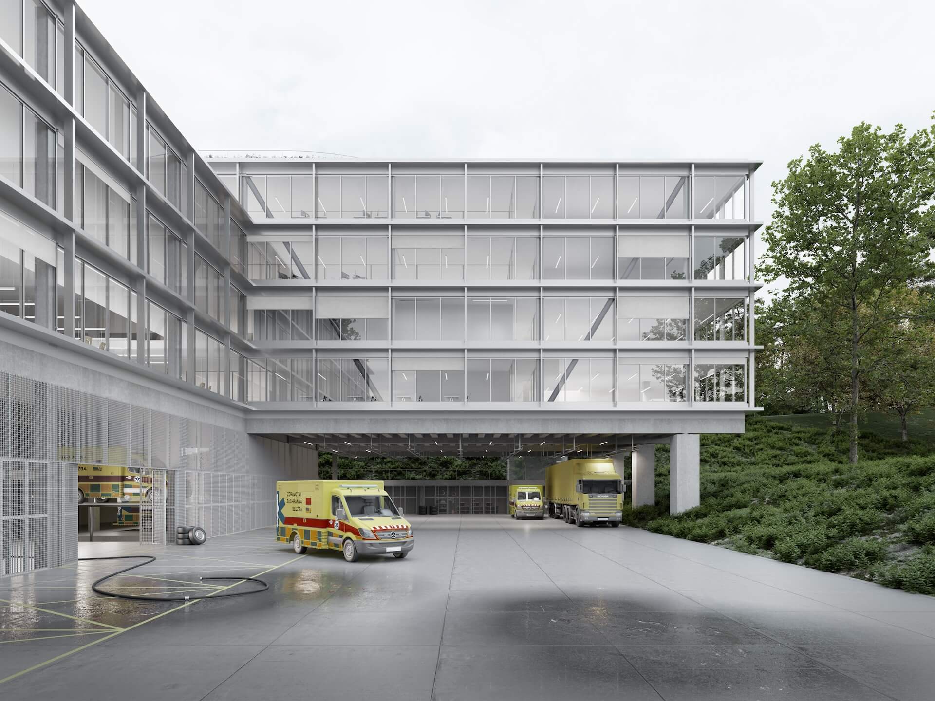 The administrative-technical building of the Emergency Medical Service will be the primary base for all Prague emergency medical service groups, so the topic of “communication” is a key part of our proposal. Whether it is virtual, operational or interpersonal communication, in all cases it has the potential to save lives. A safe, smart and efficient organization of the house has therefore become an essential prerequisite of the design. The answer lies in the spiral motif that ascends through the various safety levels of the program, forming the basic backbone for the organization of the entire house.